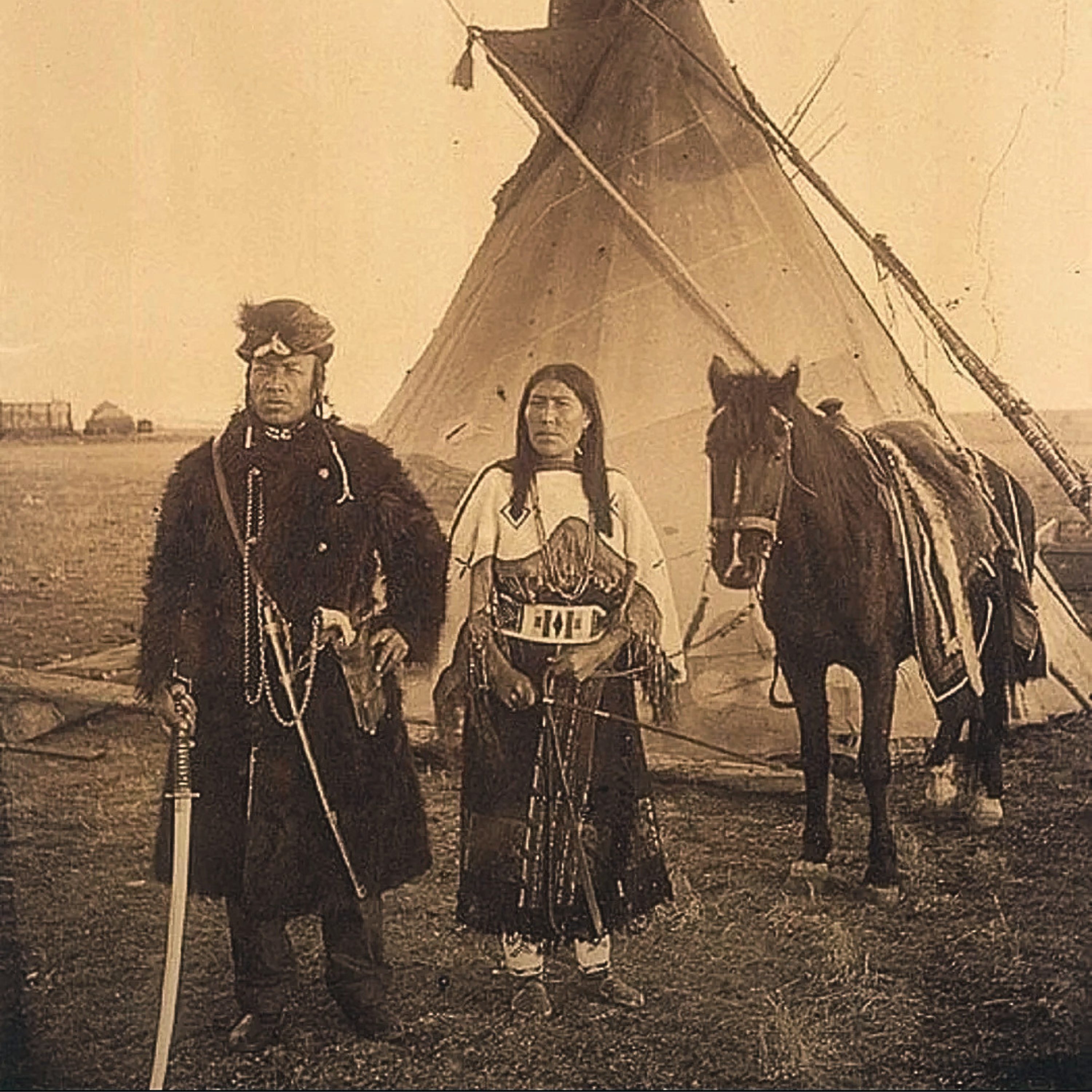 His subject was a Blackfoot scout named Dog Child, aka Winnipeg Jack, who was employed by the North West Mounted Police. Standing beside Dog Child was his wife, The Only Handsome Woman, draped in a fringed buffalo hide dress with a heavily beaded shawl. Behind them was a tipi, and off to one side, a horse waited patiently. Everything in the frame made sense except for the object held loosely in Dog Child’s right hand: a Japanese katana.